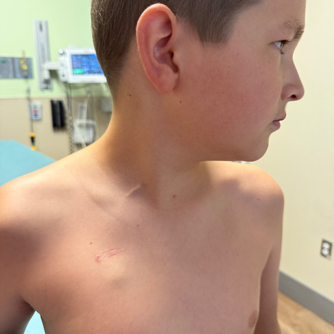This morning Cooper said good bye to Bruno with a big smile on his face! Bruno (his port) has served it's purpose. It's given him the ability to receive the chemo medicine he's needed throughout the last 9 months. So, we thanked it and then said "get out of here!"